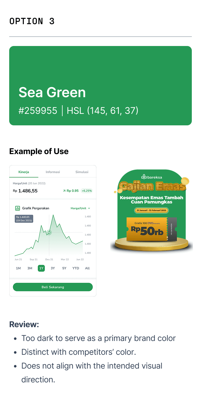 One of the first steps in the exploration process was to figure out for a brand-new color direction. We curated and reviewed potential new colors before narrowing them down to a few strong choices. From the shortlist, discussions within the team helped us select the final primary color that best represented Bareksa’s identity with fresher look.