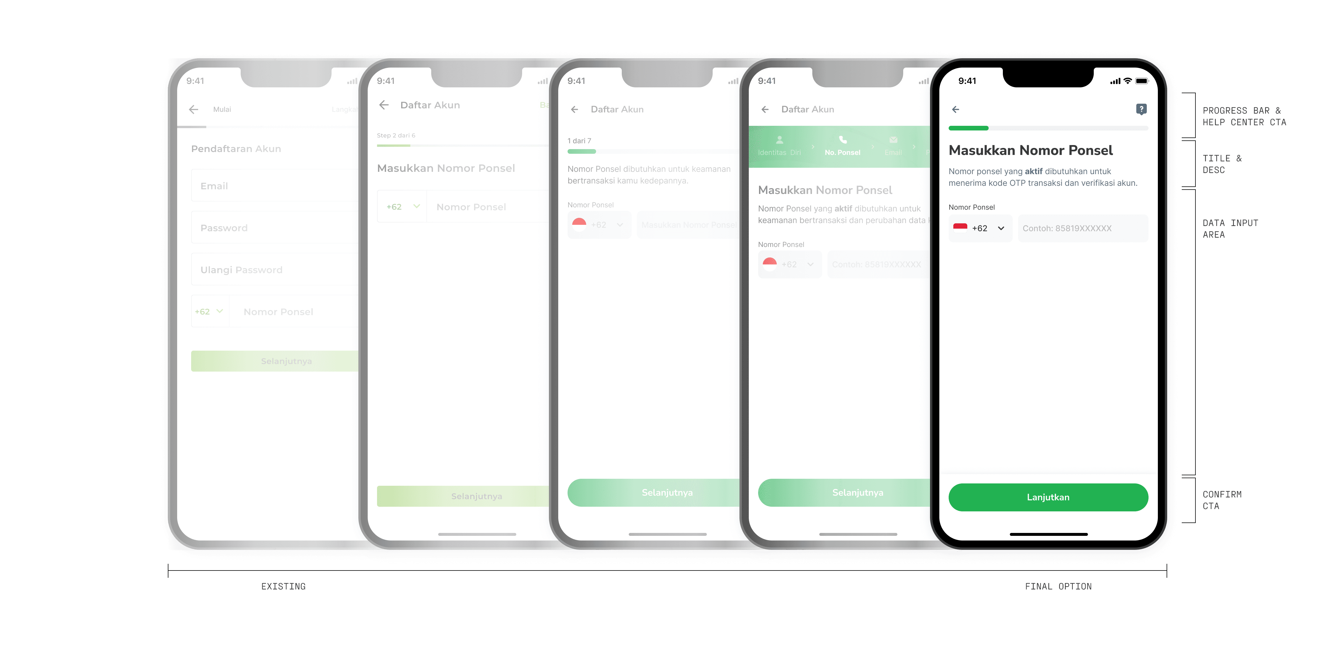 In carried out the UI explorations, one of the key principles was to ensure that users only need to input one important data per page so users don't get overwhelmed by cognitive load (Miller’s Law). This approach helps reduce drop-off rates, simplifies the flow, and minimizes potential edge cases. The overall structure of the onboarding UI template remained largely consistent throughout the design.