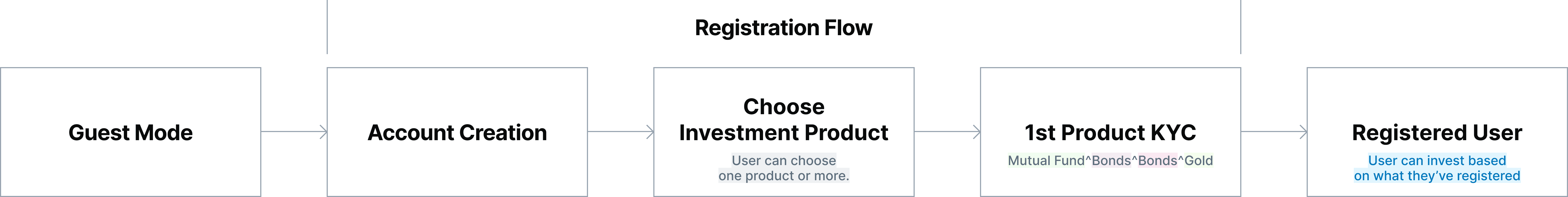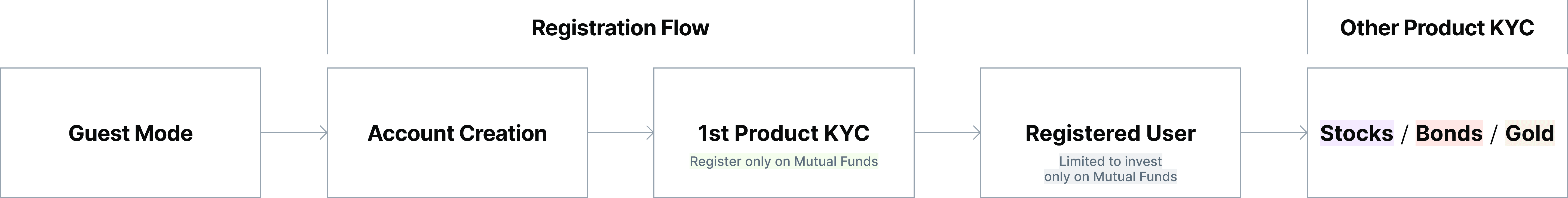 The journey requires users to go through an account creation process followed by a KYC process for Mutual Funds only, regardless of their actual product interest.