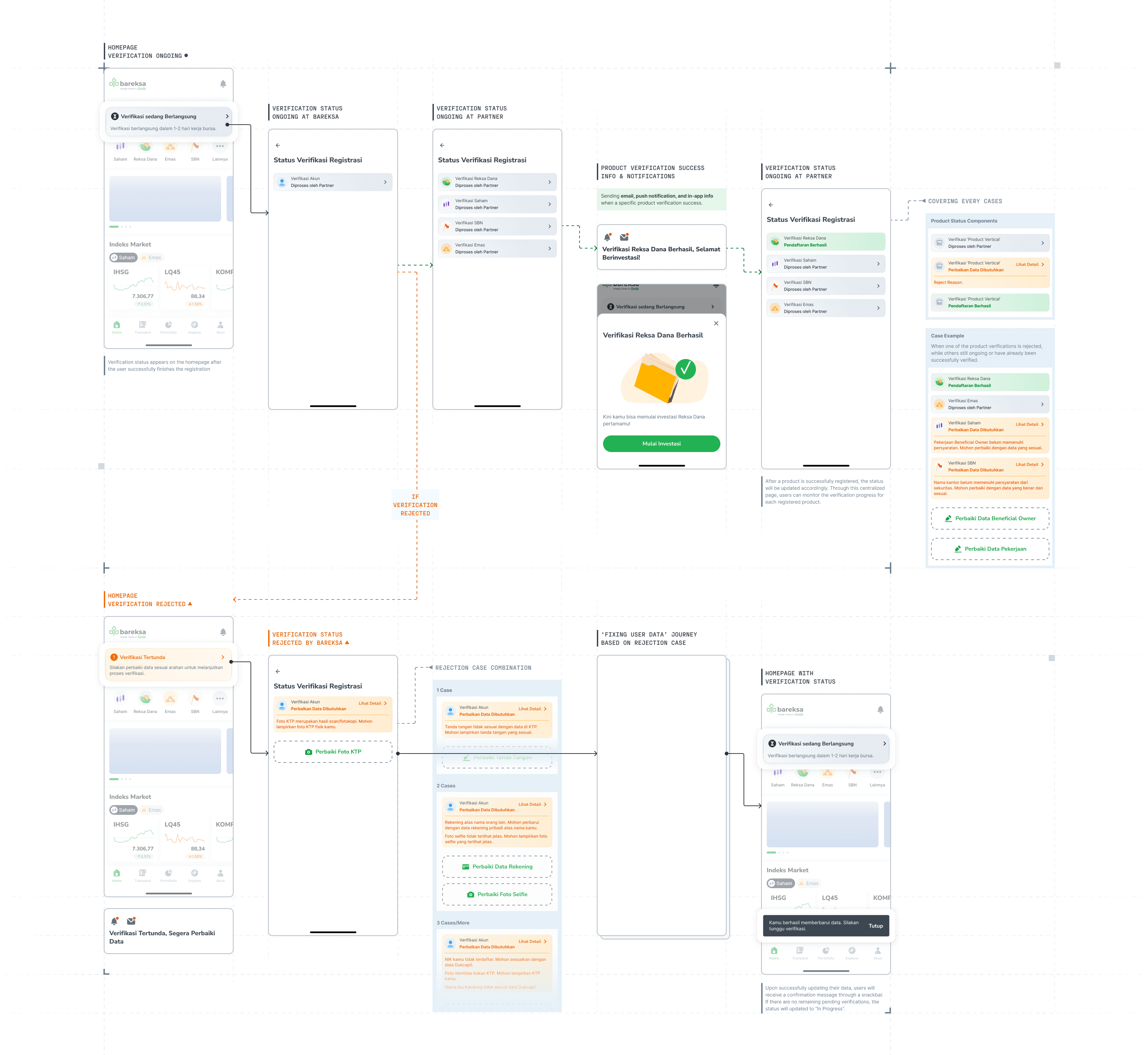 Below is an example of the user verification journey, highlighting how the design clearly communicate and inform user's verification status. It demonstrates how users are informed about ongoing processes, notified of any rejected verifications, and guided on the next actions they need to take to complete their onboarding.