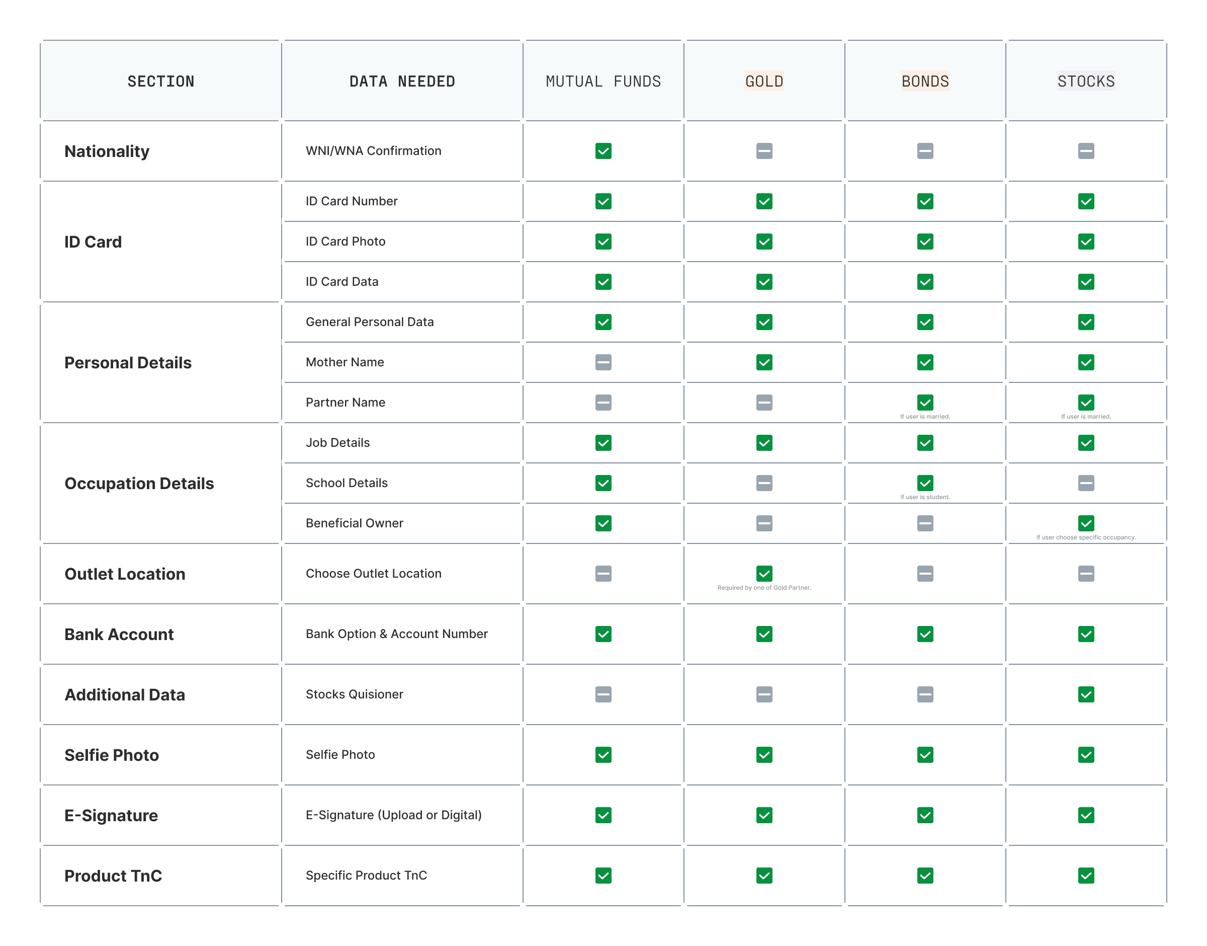 When the project started, Bareksa had four main investment products: Mutual Funds, Gold, Government Bonds (SBN), and Stocks. Each product required user-registration data, some of which overlapped, while others were unique to each product.